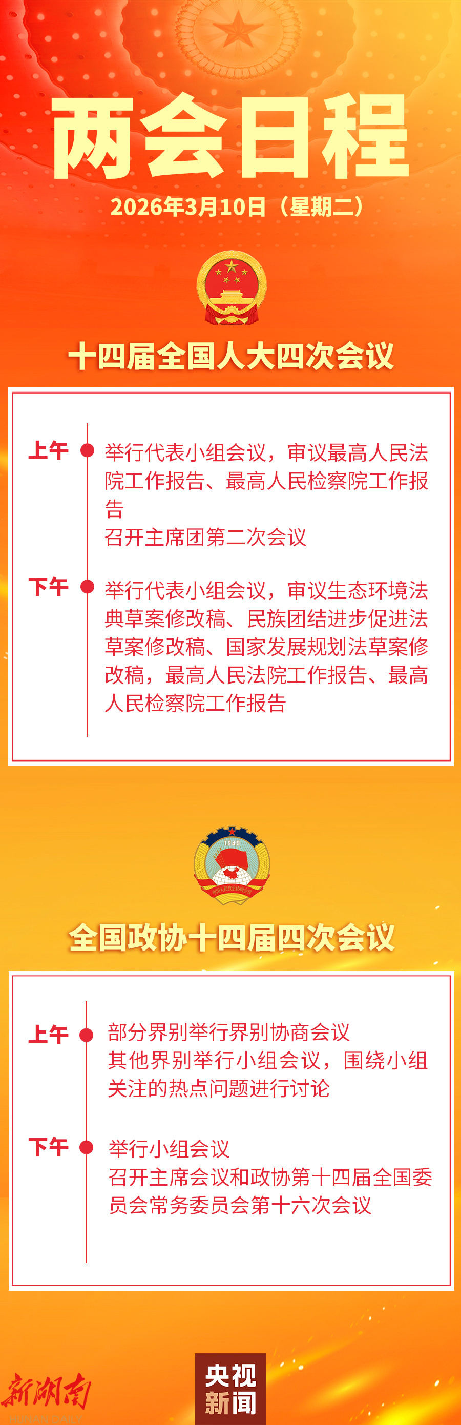 两会日程预告丨3月10日:人代会审议“两高”工作报告等 政协举行界别协商会议和小组会议