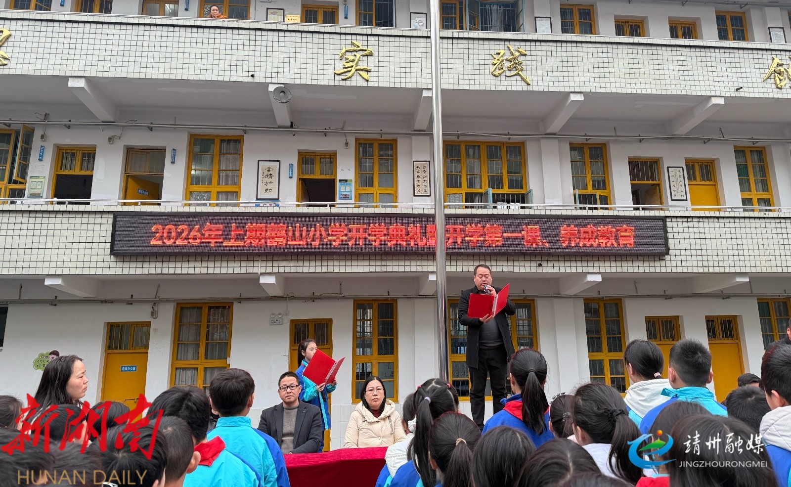 靖州融媒3月10日讯 (通讯员 李兴旭 张德志 臧一菲 )3月10日,靖州苗族侗族自治县鹤山小学举行开学典礼暨“开学第一课·养成教育”活动。校长张德志为全校师生讲授思政课,围绕理想信念、行为习惯、安全健康等内容,引导学生扣好人生第一粒扣子,争做文明向上的新时代好少年。
