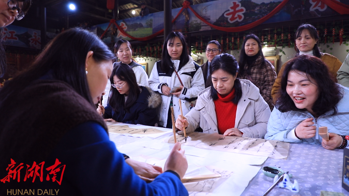 在勾蓝瑶寨,大家漫步古朴青石板路,参观瑶族传统古建筑,在瑶族文化展厅、女性文化体验馆等沉浸式领略瑶汉文化交融的独特魅力。国家级非遗女书传承人胡欣现场教学,大家学写女书、DIY女书文创,在一笔一画间感受千年前女性创造文字的智慧与力量。在勾蓝瑶寨“洗泥晚宴”上,大家积极参与“竹竿舞”“你比我猜”等互动节目,现场欢声笑语不断,进一步增进了交流、凝聚了团队合力。