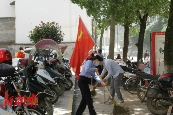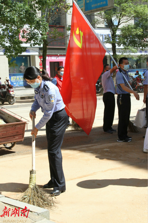 桂东县融媒体中心6月7日讯(通讯员 黄平 罗映)6月5日,桂东县公安局民警们来到湘赣路和迎宾路开展卫生大扫除,并雇用了一辆农用车来清运垃圾。烈日当空,街道上留下的淤泥迅速变干,车辆经过后扬起阵阵灰尘,民警们认真地清扫街面和人行道,用铁锹将残留在角落里的淤泥一一铲除,喊着口号合力将清理出的笨重垃圾装上清运车。在民警们的努力下,街道逐渐恢复了往日的美丽。