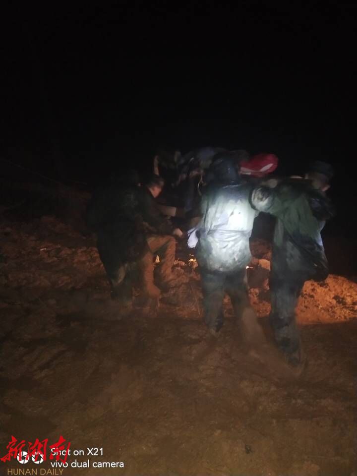 吴建峰来不及喘口气,又马不停蹄地赶到铜锣坵组李益生家中。年近60岁的李益生是独身居住,他的房屋被泥石流冲垮,李益生被压在屋内,村支书带领群众将其解救出,可是他的右手及左腿骨折,无法行动。一边是受伤的手脚急需医治,一边是120急救车被挡在坍塌的泥泞外进不来。吴建峰当即拍板:送出去!天雨路滑,一个人行进都十分困难,如何才能把受伤行动不便的李益生送出村去救治?吴建峰立即组织现场的群众,找来一个长长梯子,将李益生牢牢地固定在梯子上。现在的问题就是由谁来送出去,分成几组的武警力量显然不够。周围的群众顿时群情激昂,几个党员和群众纷纷上前主动请缨,立即组成了一支护送伤员的“行动小队”。