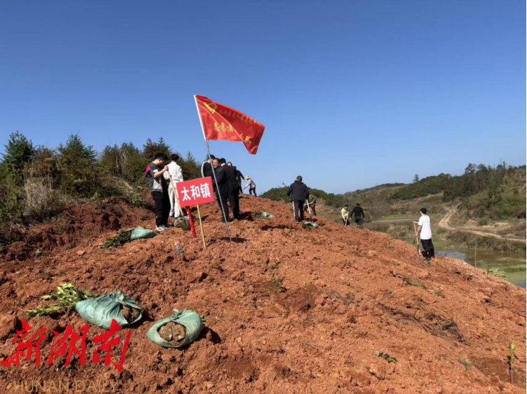 湖南日报·新湖南客户端3月12日讯(通讯员 李俊帆 曹梁晋 邝少华)春风拂绿野,植绿正当时。在第48个植树节来临之际,3月11日,永兴县太和镇党员干部、群众志愿者100余人,同县纪委监委、县委巡察办、县退役军人事务局、县教师发展中心等单位的党员干部一道,在鲢鱼村开展“共建生态家园 守护绿水青山”义务植树活动,以实际行动践行绿色发展理念,为乡村振兴厚植生态底色。