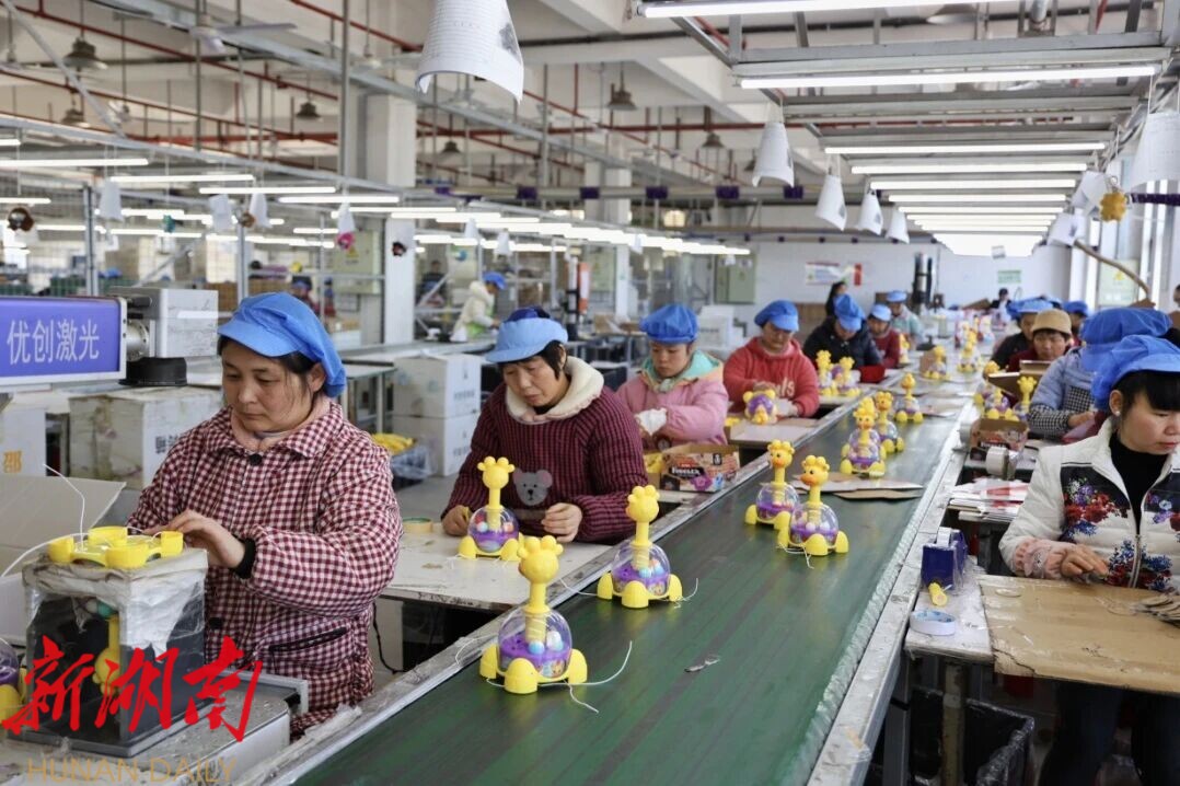 走进位于园区的邵阳市华登玩具制品有限公司生产车间,机器轰鸣声不绝于耳,自动化注塑机高效运转,工人们在流水线上熟练地进行组装、检测、包装。一只只精美的电子玩具、塑胶玩具“整装待发”,即将漂洋过海出口至美国、日本、韩国等多个国家和地区。作为香港华登集团独资的外资企业,华登玩具自2021年落户新邵以来,凭借过硬的产品质量和稳定的国际市场,迅速扎根成长,目前已带动周边近500名群众实现家门口就业。