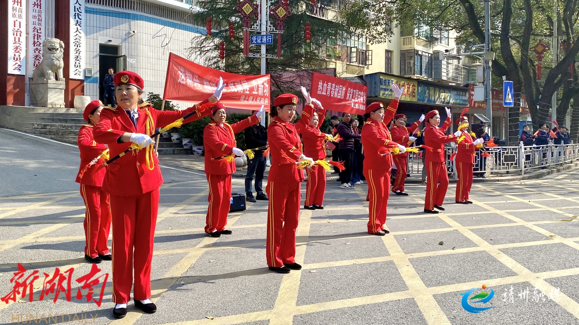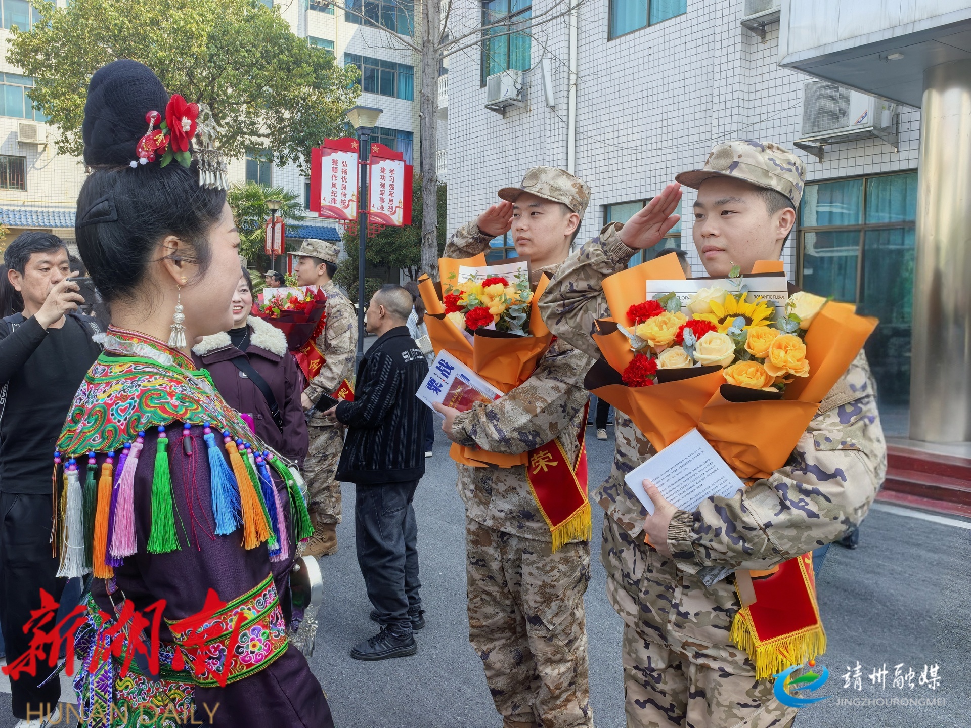 室外欢送暖意融融。街道两旁苗鼓、霸王鞭、舞龙舞狮及苗族歌鼟、侗族琵琶歌等民族特色表演轮番上演,各族群众纷纷为入伍新兵送上祝福,绘就军民同心、鱼水情深的动人画卷。