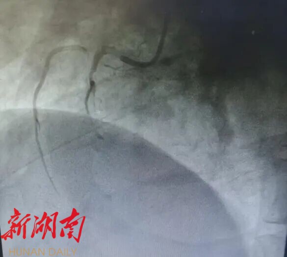 复查心电图明确诊断为急性下壁心肌梗死,病情极其凶险。冠脉造影结果显示:冠脉三支严重病变,其中右冠状动脉中段急性完全闭塞,伴大量血栓影,合并右冠自发性夹层,属于极高危复杂病变,随时可能再次发生恶性心律失常 、 心源性休克甚至猝死。