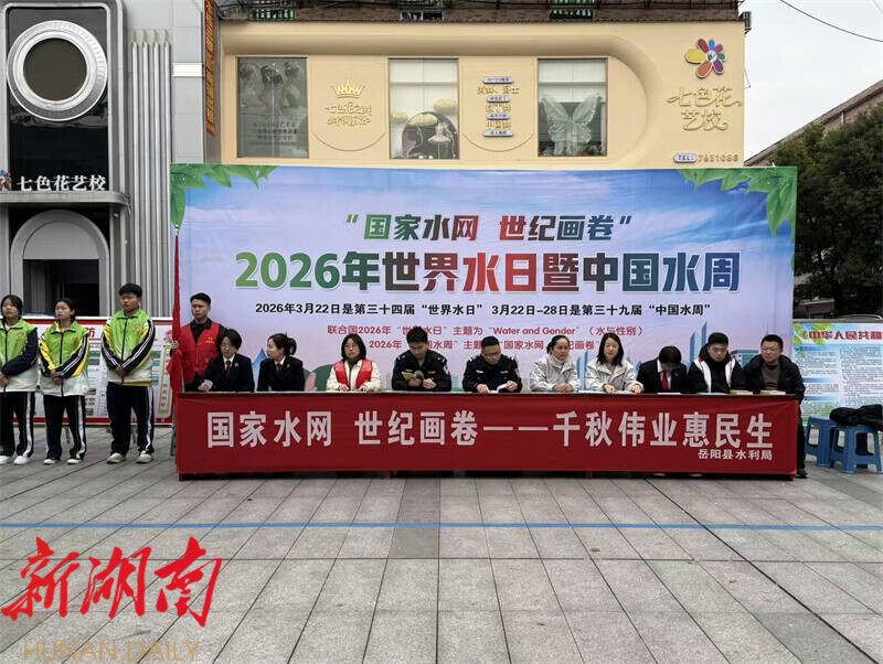 湖南日报·新湖南客户端3月20日讯(通讯员 关源涛) 在第三十四届“世界水日”和第三十九届“中国水周”来临之际,3月19日,岳阳县举行2026年“世界水日·中国水周”系列宣传活动,深入贯彻落实习近平生态文明思想,增强全社会节水、爱水、惜水、护水意识。本次活动由县河长制专项工作组、县水利局组织实施,联合县人民检察院、县人民法院、县公安局、县数据局、县污水处理厂、县洞庭供水有限公司、县融媒体中心、县河小青行动中心、新墙镇等多方力量共同参与。