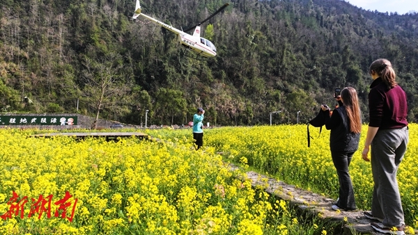 与此同时,黄龙洞景区直升机游览项目备受青睐。游客乘直升机升空,360度俯瞰峰林、花海与田园风光,以全新视角感受张家界春日之美,空中游览成为春季热门打卡体验。眼下正值黄龙洞景区生态广场最佳赏春期,花海与溶洞、空中游览联动,丰富了旅游产品供给,持续擦亮张家界春季旅游品牌,助力入境游市场稳步增长。