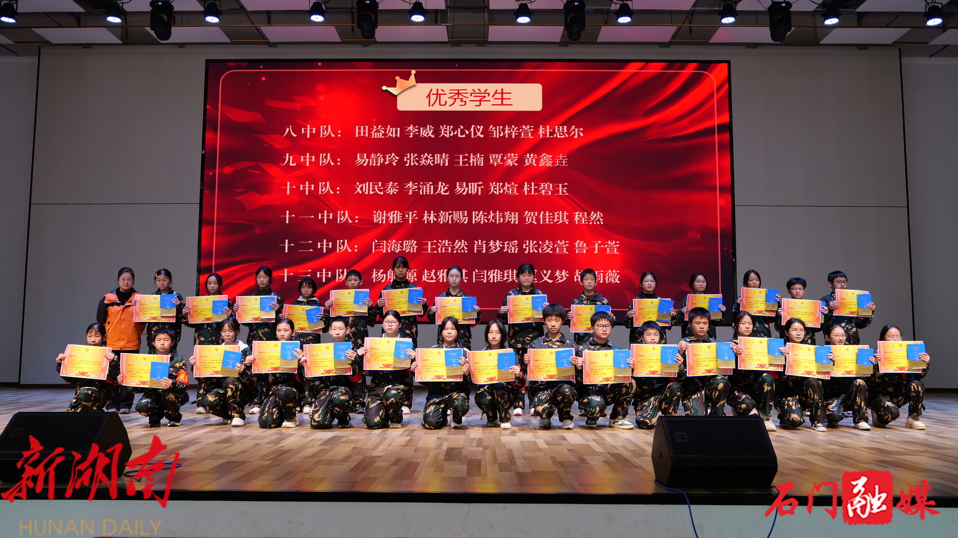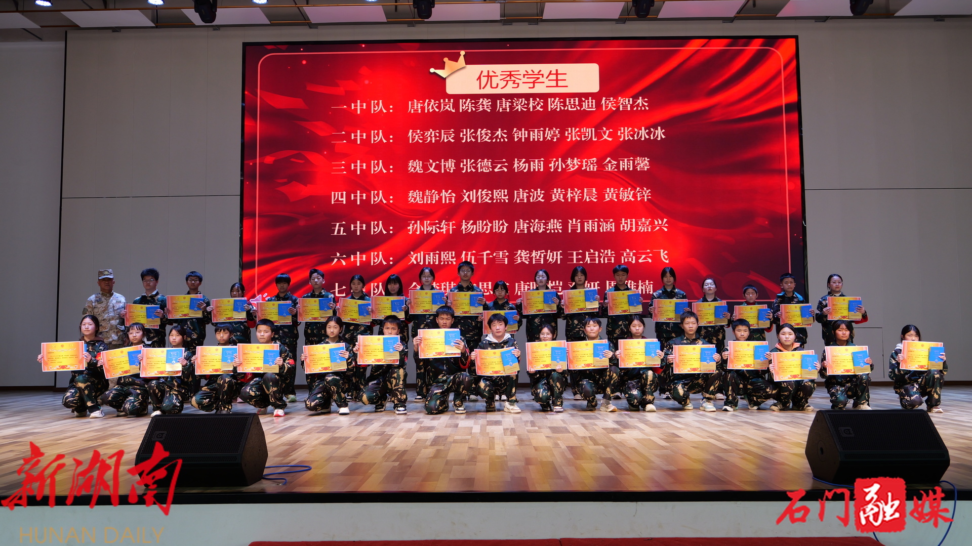 中心副校长沈艳妮宣布评优评先结果。“优秀中队”“优秀学生干部”“优秀学生”一个个名字被念出,一份份荣誉被捧起。夹山官渡学校副校长张健为“优秀中队”颁奖,中心校长易秦为“优秀学生干部”颁奖,总教官刘建军、副校长沈艳妮分批次为“优秀学生”颁奖。每一次上台,都伴随着热烈的掌声。