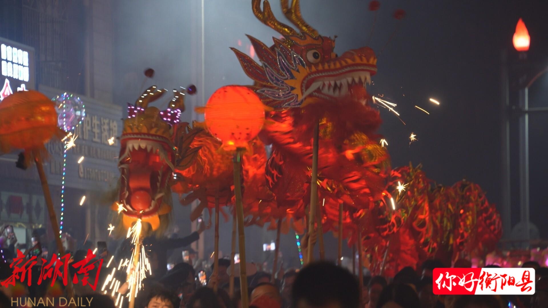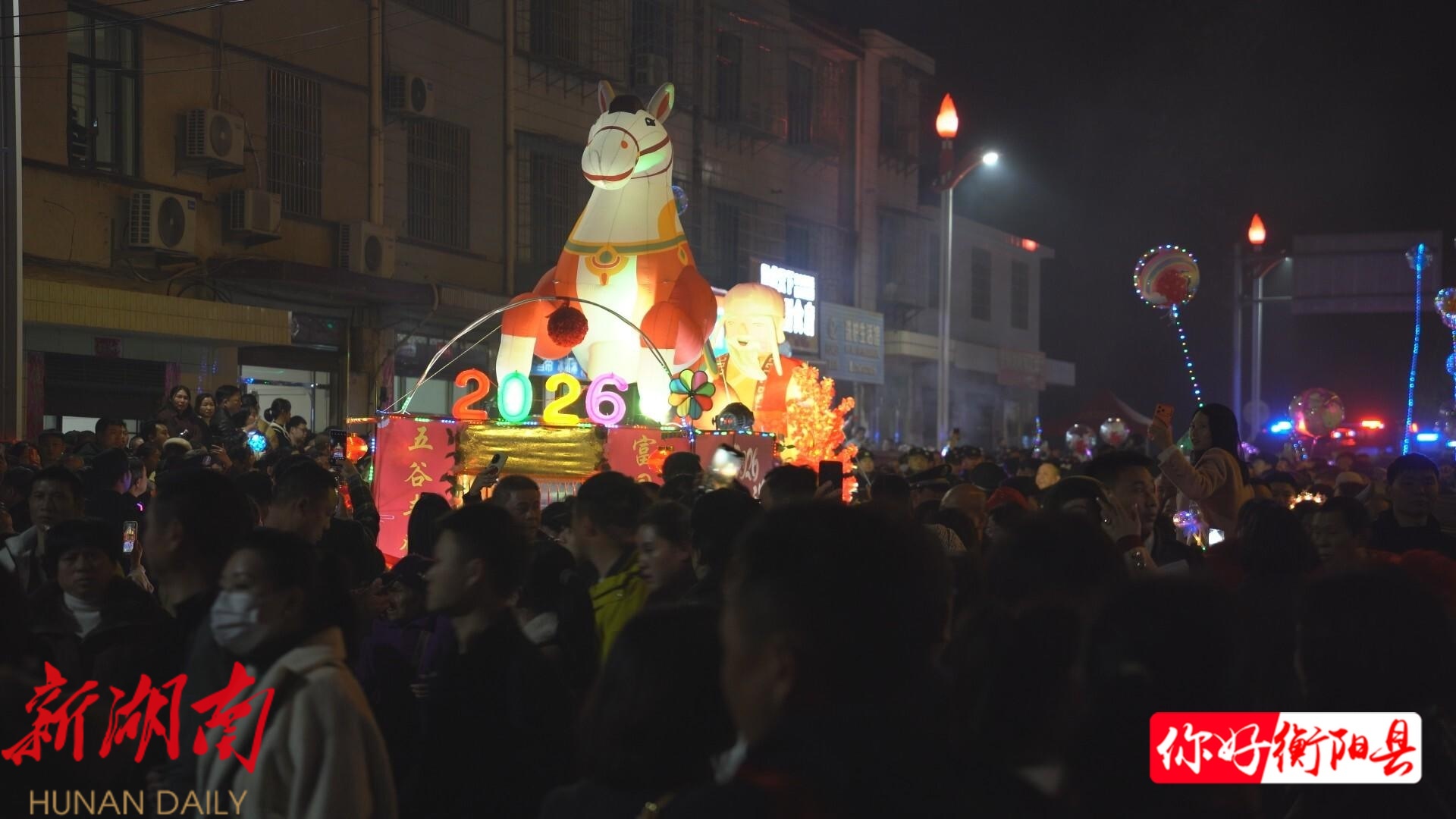 夜幕刚刚降临,界牌镇的大街小巷挤满了前来观灯的游客与附近村民。随着巡游队伍启程,整条街道瞬间被灯火点亮。队伍最前方的“领队”手持火灯,身后是写有“天地人和”“马年大吉”的灯牌,在龙灯与花灯的簇拥下,沿着规划路线巡游。沿途居民在家门口燃起火堆、放烟花,将界牌镇的夜空映照得流光溢彩,整个集镇宛如白昼。人群中的欢呼声此起彼伏,大家拿出手机、相机,争相记录这场难得一见的民俗盛景。