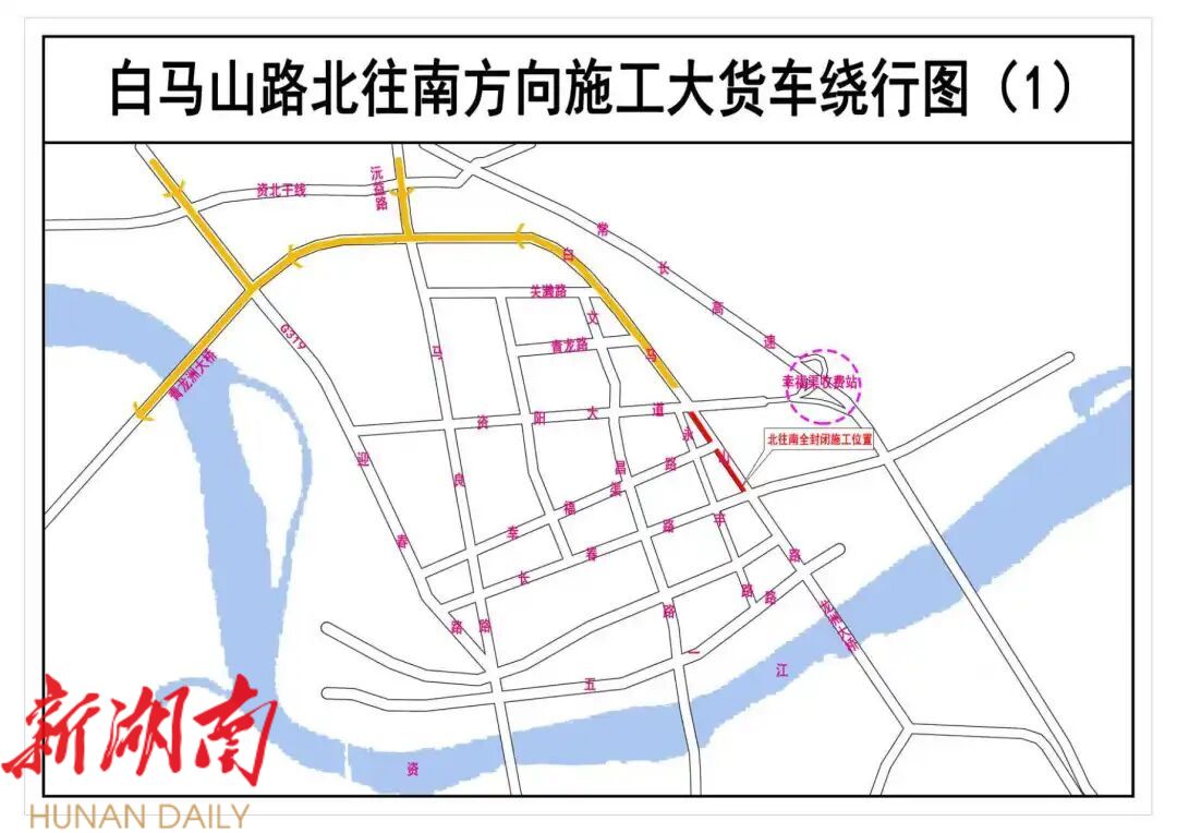 1.经资阳大道或白马山延伸线-青龙洲大桥-虎山路-G536-云雾山路-金山南路-凤溪路-康富南路-关山路绕行。