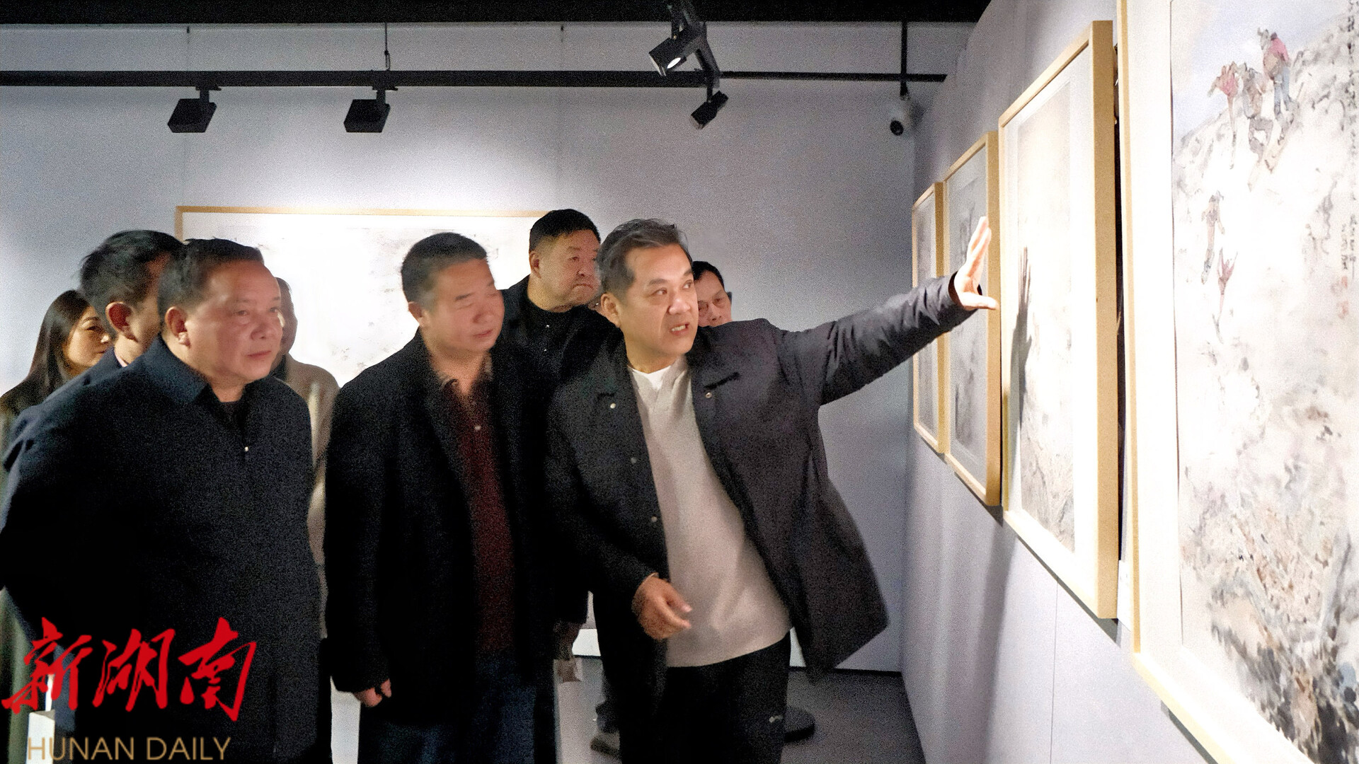 开幕式后,艾国带领一众嘉宾缓步走入展厅,逐幅为大家解读作品。他结合“俯远法”创作理念,细致讲解画作的笔墨章法、空间构思,以及融入的家乡山水情怀与传统美学内核。在场嘉宾凝神聆听,时而驻足细看,时而交流感悟,在观展中真切感受传统山水画创新表达的独特魅力。随后学术研讨会同步举办,业内人士共探传统水墨创新路径,为湘西南艺术文化交流再添新彩。