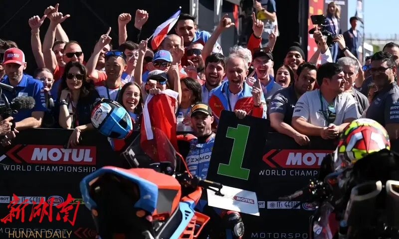 法国车手驾驶张雪机车的820RR-RS赛车获得WSBK葡萄牙站冠军,赛后高举五星红旗。据张雪机车