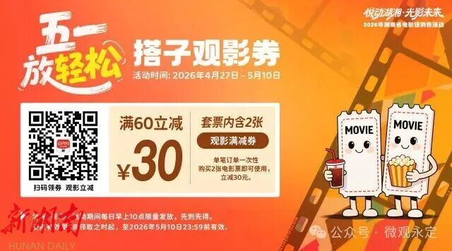 观影省钱、买书优惠、免费抽奖,湖南省2026年春季电影促消费活动又推出重磅福利,“光影书香书友观影券”“搭子观影券”覆盖世界读书日、五一小长假,只要人在湖南就能参与。