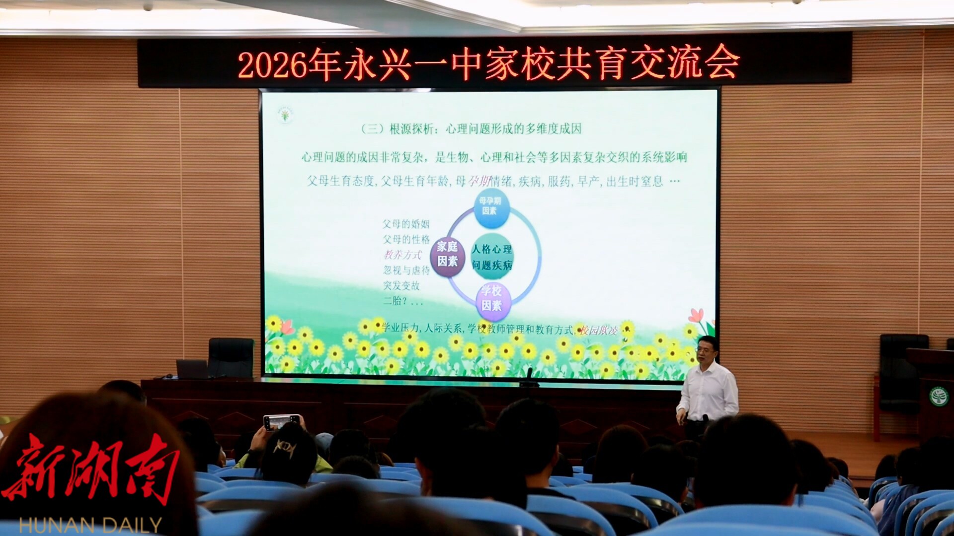 湖南日报·新湖南客户端4月21日讯(通讯员 李璋瑞 胡洪丹)4月19日上午,2026年湖南省重点民生实事心理健康和家庭指导服务“向阳花”行动走进永兴县第一中学。在学校的蓝色报告厅内,一场面向高一学生家长、主题为“读懂高一少年心,赋能青春成长路”的专题讲座温暖开讲。