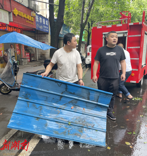 5月10日上午,乌云密布下起了倾盆大雨,大风肆虐下,一块长宽约2*1.5米的铁片被风吹挂在五强溪农贸市场外的一棵大树上,大风大雨中铁片摇摇欲坠,随时有掉下来砸到路上行人及过往车辆的危险。接到居民反映后,长庚街道应急救援队和熊家台社区干部第一时间赶往现场,疏散周边车辆及行人,设立安全警戒区域,利用消防车水枪成功将铁片冲下,处置过程中,干部们和救援队分工明确、反应迅速,受到了周边商户及居民的好评,现场一名居民说道:“我们前脚拨通电话,你们后脚就带着消防车赶过来了,为你们的工作效率点赞!”