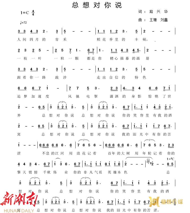 湖南日报·新湖南客户端 7月9日讯 《总想对你说》是路兴华老师在中国音协为庆祝中国共产党成立100周年“心中的歌”全国优秀歌词100首中的优秀作品。作为新时代大学生,我们沐浴在阳光下,生活在幸福里,这来之不易的美好生活是一代又一代的革命先辈无私奉献换来的。学党史,知党恩,跟党走,中国共产党成立100周年之际,这首《总想对你说》道出了我们青年一代的心声,也是对为社会努力奉献的每一位普通人表达我最真诚的祝愿与感谢。