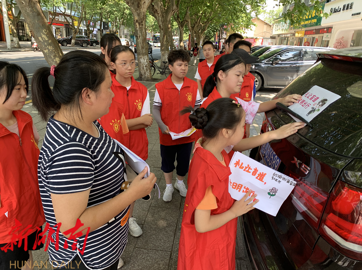 7月27日,武陵区白马湖街道富强社区组织小小志愿者,开展“礼让盲道,文明出行”新时代文明实践活动,在社区工作人员的带领下,小小志愿者走上街向市民呼吁文明出行,并为占盲道的车辆贴上温馨提醒。