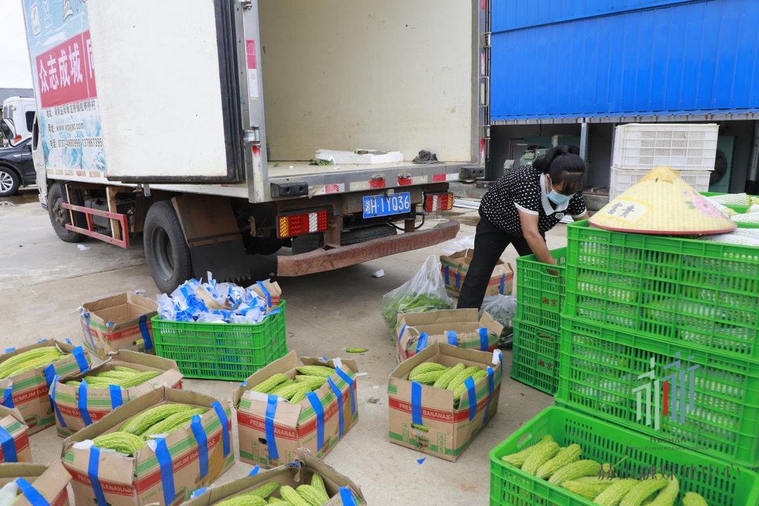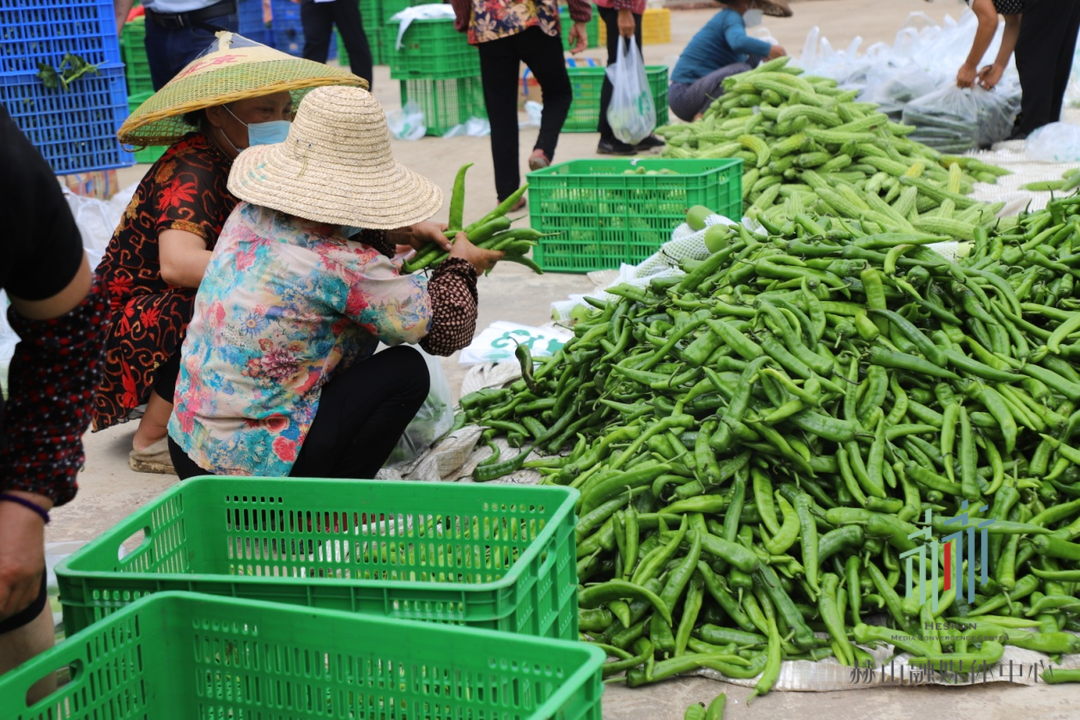 8 月 12 日 下午 , 在赫山区的衡龙桥镇 银桥有机蔬菜种植农民专业合作社 ,一大片绿油油的菜地里,10多位村民正戴着口罩, 在热火朝天地采收辣椒 、苦瓜、空心菜等时令蔬菜 。