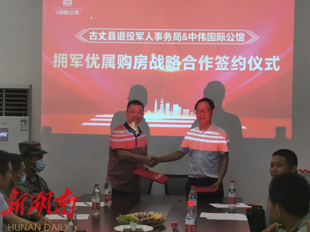 新湖南客户端9月10日讯(通讯员 余国林)退伍不褪色,军民一家亲。9月9日下午,湘西土家族苗族自治州古丈县退役军人事务局、县人民武装部、中伟国际公馆举行“退役军人光荣返乡暨拥军优属战略合作”签约仪式。县委常委、统战部部长向上、县委常委、人武部部长江志斌出席。