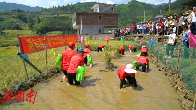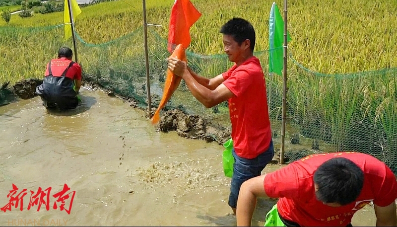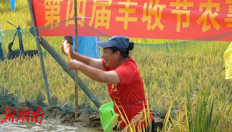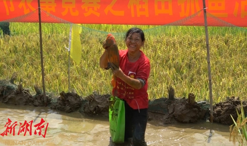 捉鱼竞赛现场,选手们甩开膀子、撩起裤管,扑扑通通地跑进水深过膝的稻田里,弯着腰进行地毯式搜索,徒手捉鱼,随着一条条漂亮的大红鲤鱼被抓出水面,围观村民们的助威声一浪高过一浪,把丰收节活动推向高潮。