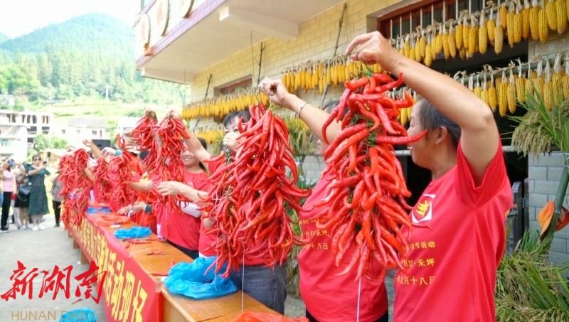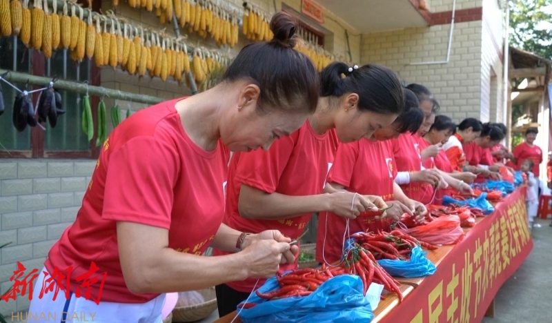 山脚下的民房前,充满“土味”的穿辣椒比赛蓄势待发,随着“预备、开始”响起,心灵手巧的妇女立即将针穿好线,然后用针线从辣椒蒂中间穿过,用最短的时间把一个个火红的辣椒全部给连接起来,串成一串。