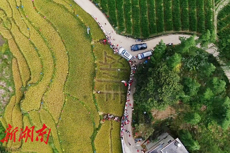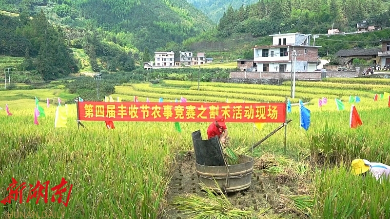 在“写”着“丰收”俩字的稻田上,参赛选手手握镰刀,迅速展开比赛。你割稻,我打谷,分工合作,手法熟练,不一会就将一整块稻谷地收割完毕,然后以收割重量评出一二三等奖。