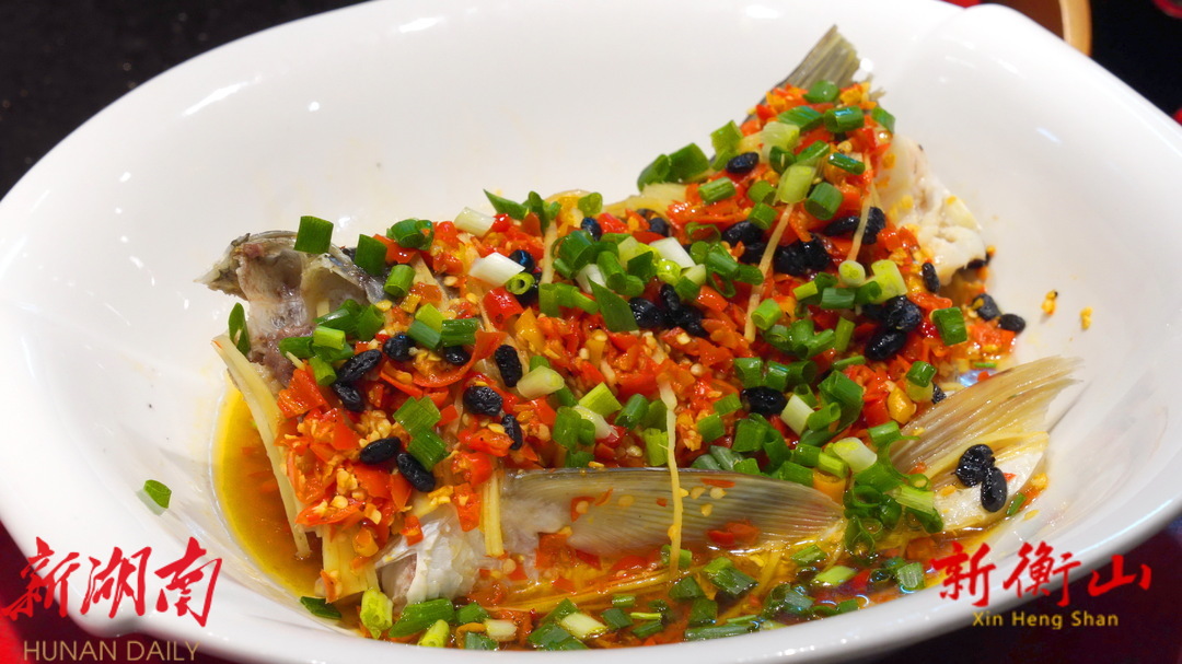 三宝蒸衡山泉水鱼,三宝即农家三宝,特质开胃剁辣椒、豆豉和姜。风味独特,口味辣中带香,是一道开胃好菜。