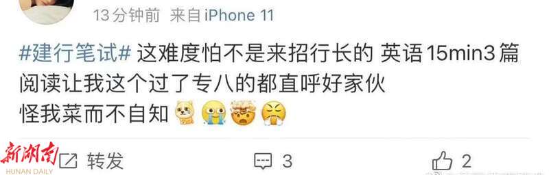 在建行笔试的当天,有网友评论:“这难度怕不是来招行长的,英语15分钟3篇阅读让我这个过了专八的都直呼好家伙。”还有网友感慨:“考了一本百科全书,三个小时抠掉了两个美甲。”