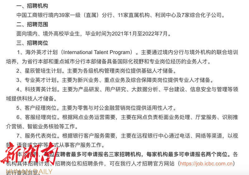 另从招聘机构上来看,主要包括总行及各地分行相关部门。比如,工商银行的招聘信息显示,招聘机构涵盖工商银行境内39家一级(直属)分行、11家直属机构、利润中心及7家综合化子公司;农业银行也涵盖总行管理本部(含派驻纪检组)以及总行直属机构。