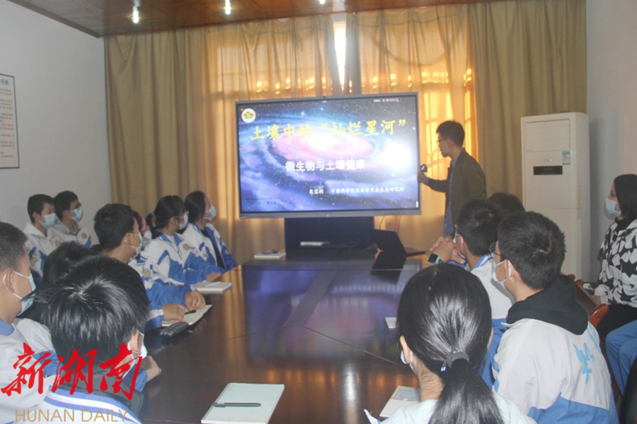 朱宝利博士为中学生带来了题为:土壤中的“灿烂星河”的科普报告,介绍桃源国家重点野外科学观测试验站基本情况、微生物与土壤健康科普报告,使中学生对野外台站和微生物有了初步的认识和了解。