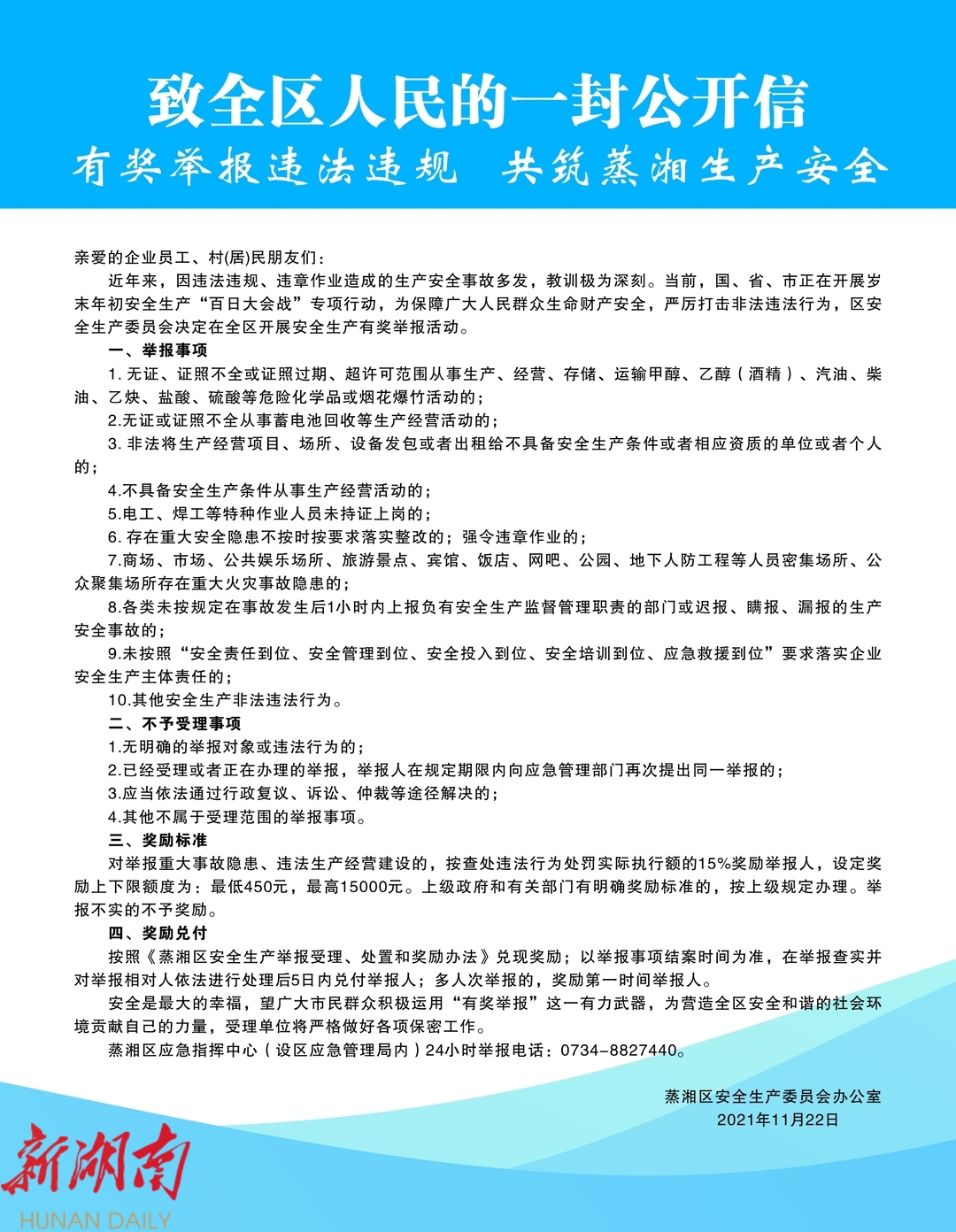 近年来,因违法违规、违章作业造成的生产安全事故多发,教训极为深刻。当前,国、省、市正在开展岁末年初安全生产“百日大会战”专项行动,为保障广大人民群众生命财产安全,严厉打击非法违法行为,区安全生产委员会决定在全区开展安全生产有奖举报活动。