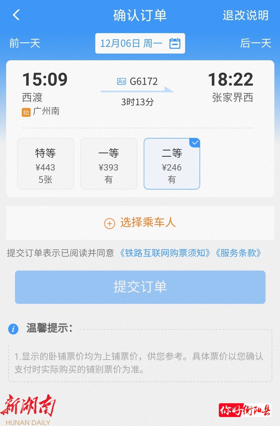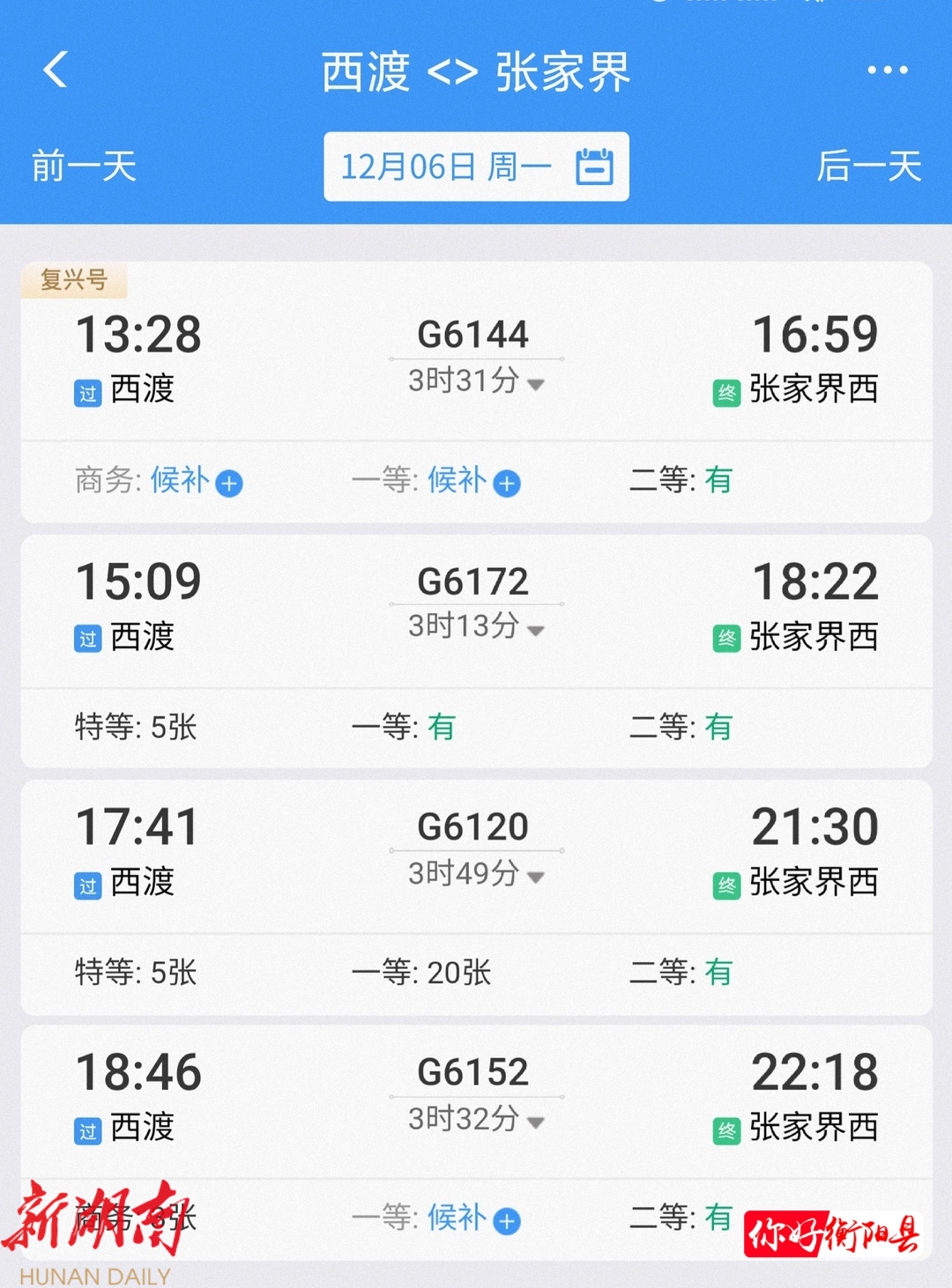 人民网北京12月4日电(记者乔雪峰)记者从中国国家铁路集团有限公司(以下简称国铁集团)获悉,张家界至吉首至怀化高速铁路(以下简称张吉怀高铁)将于2021年12月6日开通运营,张家界至怀化最快1小时10分可达,铁路部门将于12月4日9时开始发售张吉怀高铁动车组列车车票。西渡至张家界仅需3小时,二等票售价为233元、246元。