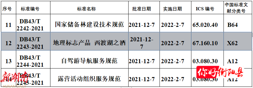 12月7日,湖南省市场监督管理局《关于批准发布〈劳动关系和谐工业园区评价规范〉等14项地方标准的通告》公告发布《地理标志产品 西渡湖之酒》(DB43/T 2243-2021)标准,该标准于2022年2月7日实施,这是衡阳县首个“地理标志产品地方标准”。