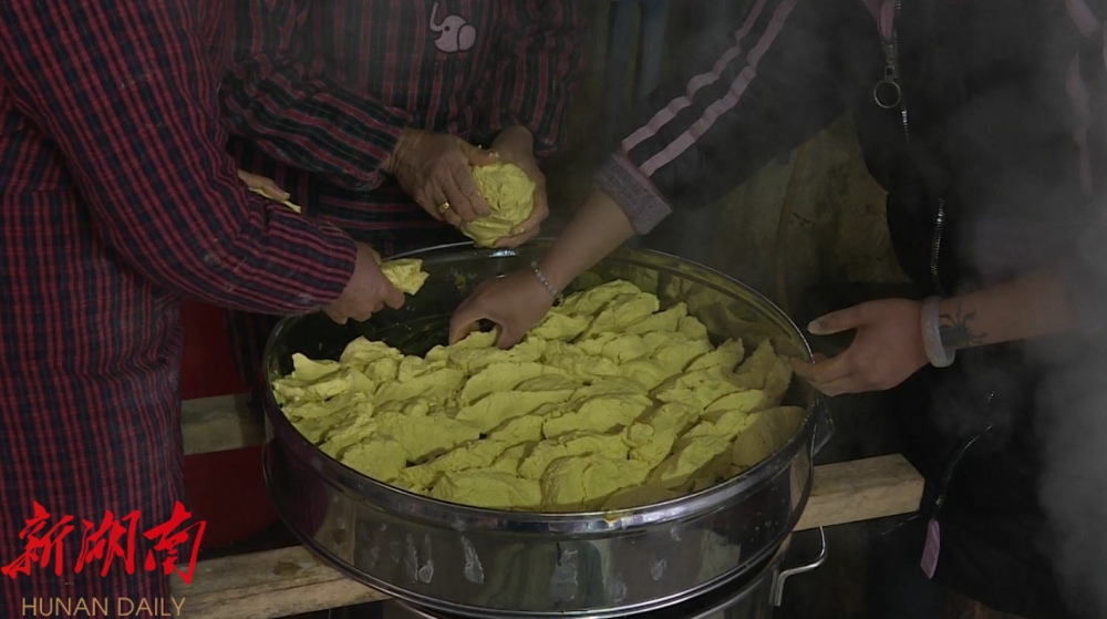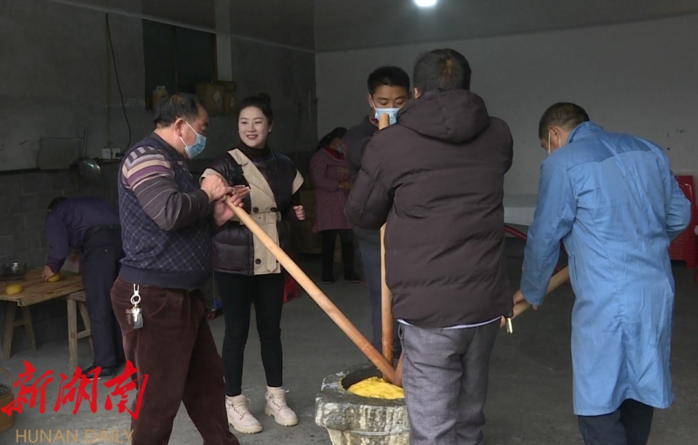 沙田镇大坑村村民郭徳会:在我们桂东来说,祖祖辈辈过年做糍粑都是一种习俗了,就等着外面的亲人、朋友回家过年;在家里的人呢,因为这个做糍粑的人要比较多,所以左邻右舍,大家一起来帮忙,你帮我做,我帮你做,也是代表着一种和谐。再说这个吃糍粑代表着团团圆圆、家庭幸福,过年了。