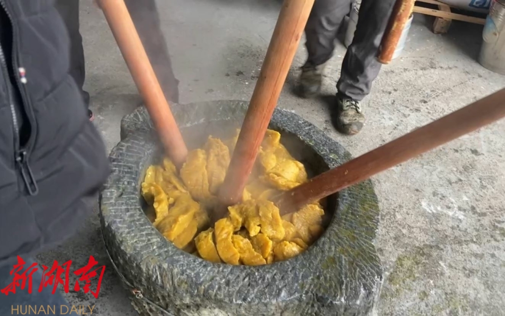 记者余妍:我们看到,刚刚出笼的糍粑,就倒入了现在我旁边的这个石臼当中,然后有4个大哥拿着木锤在抖糍粑,我想问一下,抖糍粑它有没有什么技巧啊?