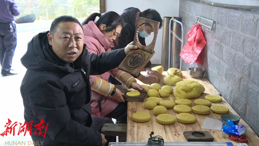 记者余妍:糍粑越打越黏,日子越过越甜。今天,我们也全程参与了做糍粑的过程,就像我手上的这个印花糍粑,就是我们今天做的,上面印有一朵花,它的意思就是花开富贵,非常美好的一个寓意。马上过年就要临近了,我们也希望外出的游子能够早日回家,一起来品尝这家乡的美味。
