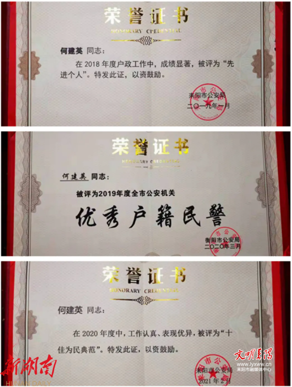 何建英便是这样一位户籍民警,从警10多年来一直在户政岗位上工作,把最美的芳华献给窗口。她曾多次受到上级表彰,2018年被评为耒阳市公安局“先进个人”、2019年被评为衡阳市公安局“优秀户籍民警”、2020年被评为耒阳市公安局“十佳为民典范”。