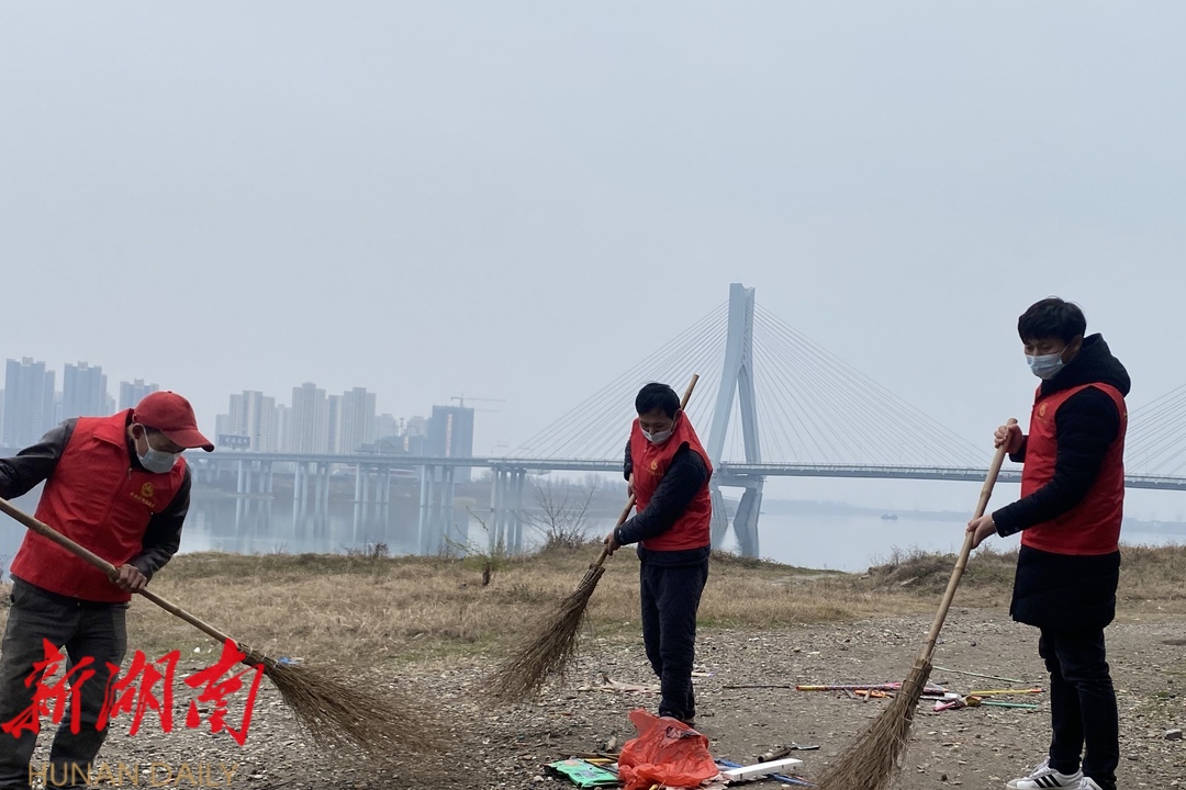 大年初一以来,落路口社区的居民们发现,新外滩小区外的沿江边多了两位“特别”的清洁工,他们穿着志愿服务红马甲,每天拿着大扫帚,把长达1公里多的江岸清扫得干干净净。