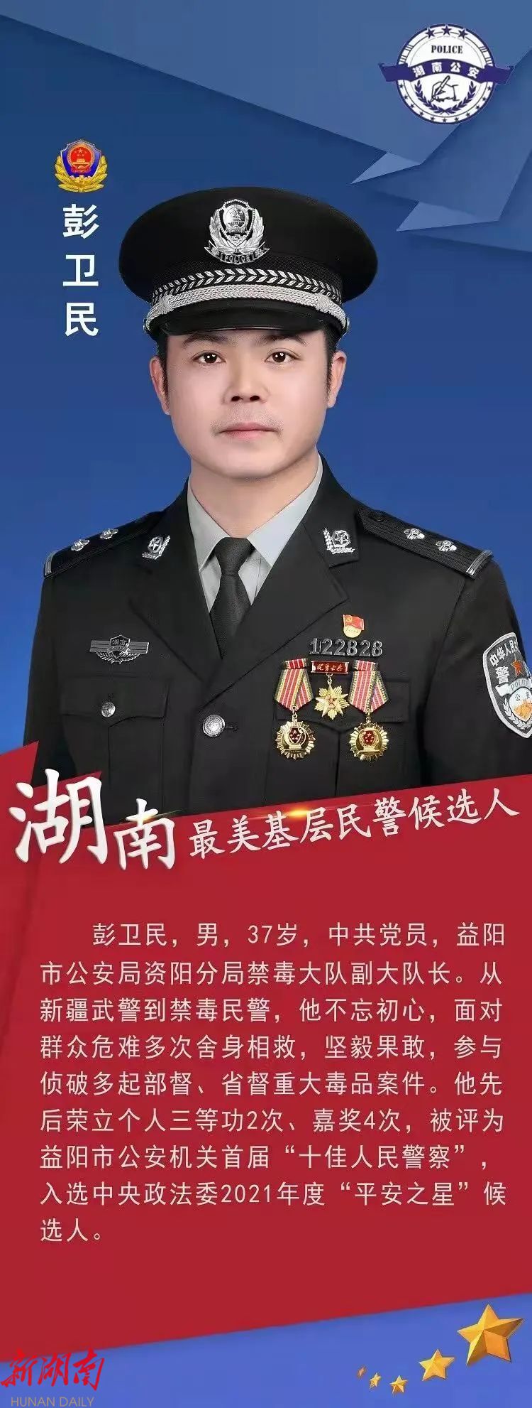 他是一名无名英雄,助人为乐,做好事不留名,辖区流传着群众“寻人启事谢恩人”的美谈;他是一名退伍军人,勇猛果敢,善战敢拼,多次负伤仍冲锋在前;他是一名禁毒民警,爱岗敬业是融进了他骨子里的忠诚本色,家在咫尺却长住执法办案区,侦查办案是他唯一的兴趣爱好。他叫彭卫民,今年37岁,现任益阳市公安局资阳分局禁毒大队副大队长。