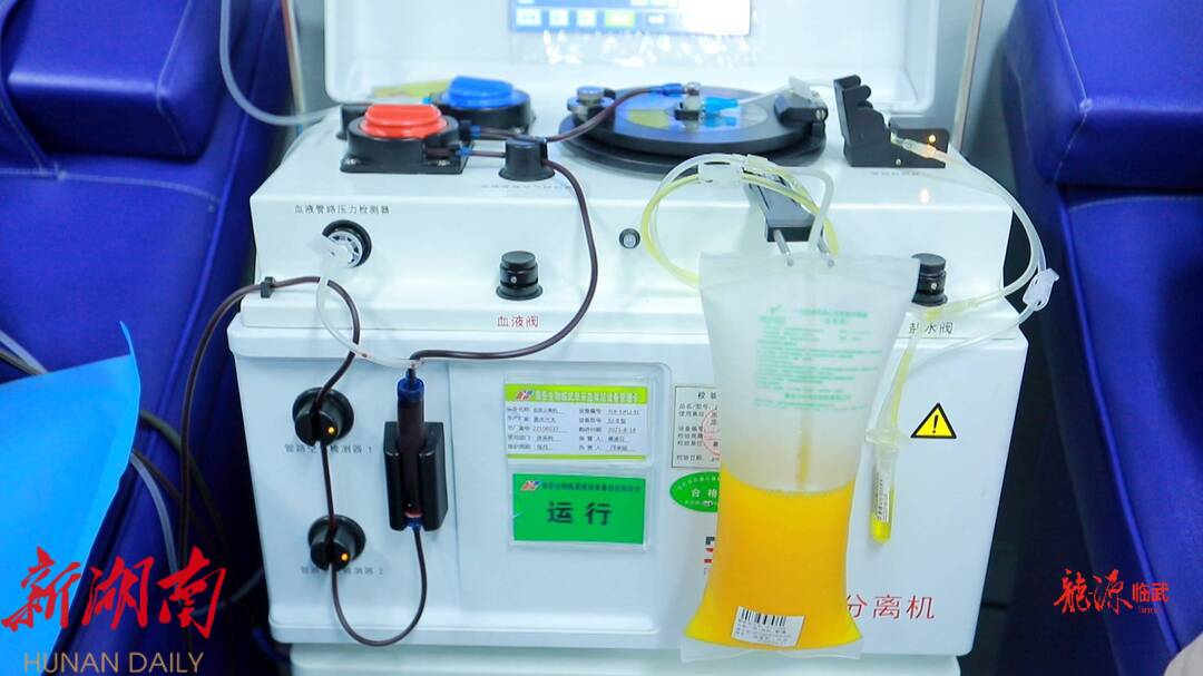 南岳生物临武单采血浆站护士长李满英: 像我们临武检察院边上的献血车,是无偿献血,而我们现在采集的是人体血液中成分,它是人体血液中的一个成分,单采是通过我们现在的智能采浆机分离出来,使用一次性耗材,经过全血采集,自动分离红细胞、白细胞、血小板,等(血)细胞分离以后就回输到献血浆者本人身上。