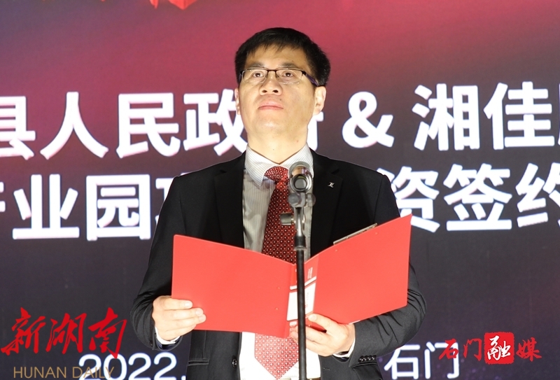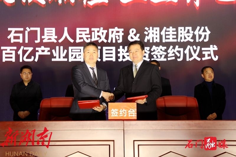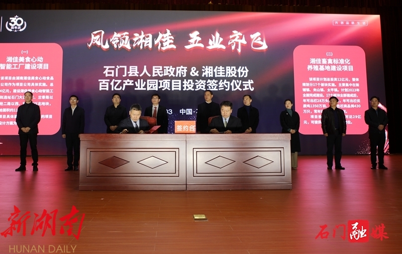 湘佳牧业于1993年组建成立,经过30年的发展,已从一个小型家族养殖企业成长为集种禽繁殖、家禽养殖、屠宰加工、冷链物流、饲料生产、有机肥产销于一体的家禽养殖加工销售全产业链企业。并于2020年成功上市,成为石门县第一家本土上市企业。此次签约的两个项目总投资16亿元,其中湘佳畜禽标准化养殖基地建设项目投产后,年产值可达29亿元,可提供就业岗位1000个以上,将为湘佳股份打造国家现代农业百亿产业园区奠定坚实基础,也将为石门经济社会高质量发展注入了强劲动能。