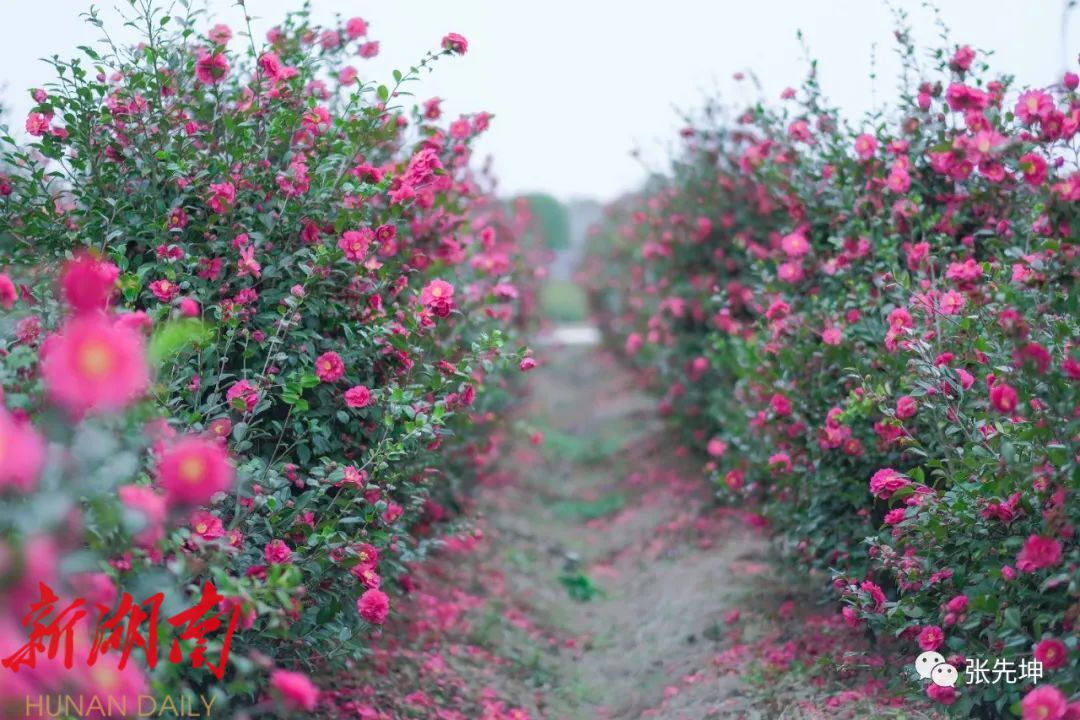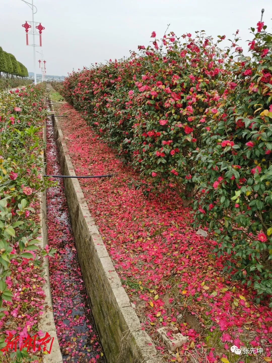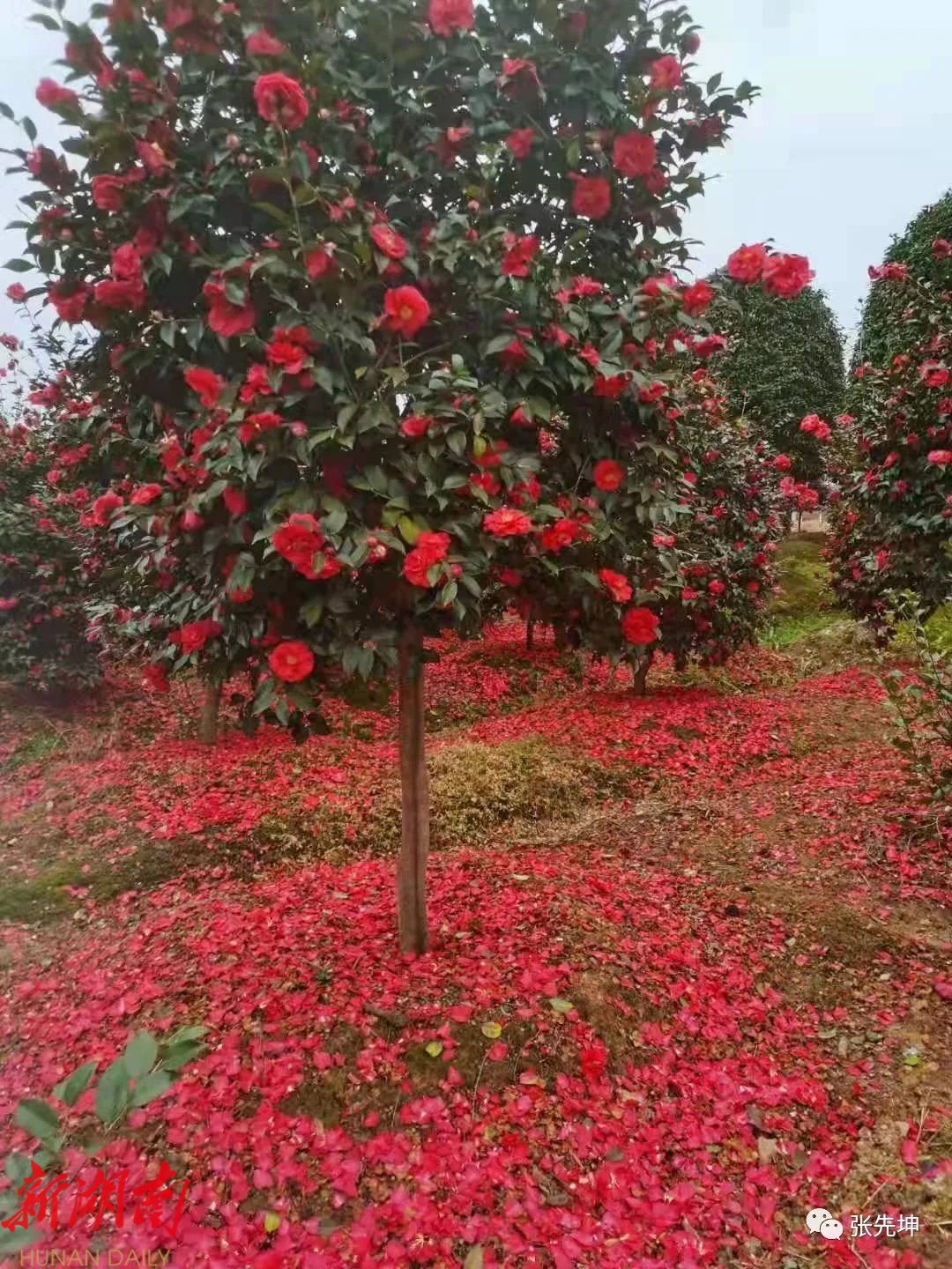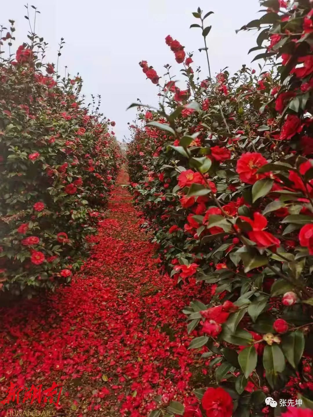 这里的牡丹花,与别处的不大一样,更像是山茶花。一眼望去,只见一畦畦、一片片,满树满树的山茶花正竞相开放,散落在地上的花瓣好似铺开的一张火红的地毯,蔚为壮观、甚是好看,真可谓“千树万树茶花开,落英缤纷花满地”!