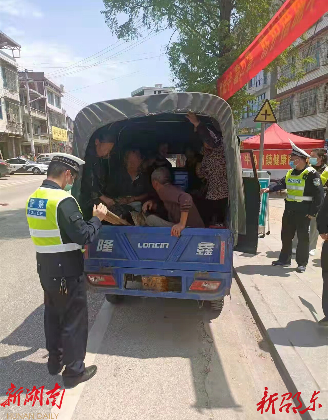 新邵东客户端4月5日讯(通讯员 舒梦龙)4月4日12时许,邵东市公安局交警大队二中队民警在属地牛马司镇疫情防控卡点开展清明节联合执勤时,查获一起三轮车超载违法行为。被查车辆车牌号湘ERJXXX,为一辆载货三轮摩托车,该车不仅超员载客10人,且存在非法改装、脱保等交通违法行为。民警立即将该车扣留,责令乘车人员换乘其他交通工具,并通知违法驾驶人黄某所在村村干部到现场一同对黄某进行了批评教育,并对黄某的违法行为依法进行严厉处罚。