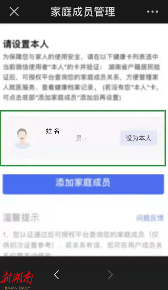 ”,选择需要设为本人的健康卡标识,点击“设为本人