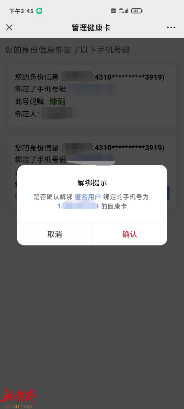 ”功能入口进入,可以解绑不再使用的手机号码,使用微信打开“湖南省居民健康卡