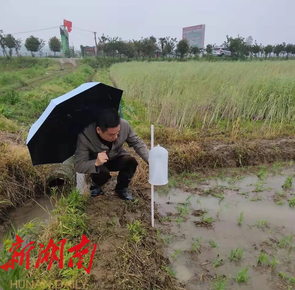 4月18日,记者在沅江市琼湖街道保民村看到,沿村道两侧稻田,每隔30米左右就布置一个白色性诱捕器,放眼望去如同绿毯上点缀的星星,正在田间指导安装的市植保植检站站长刘景波笑着打趣。