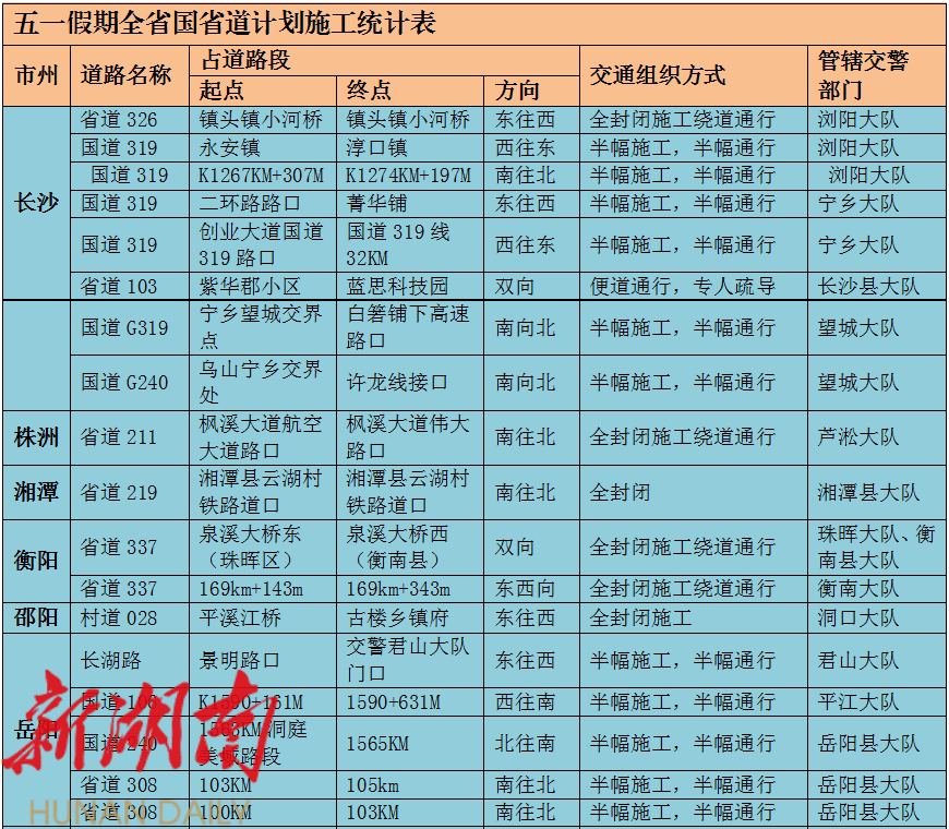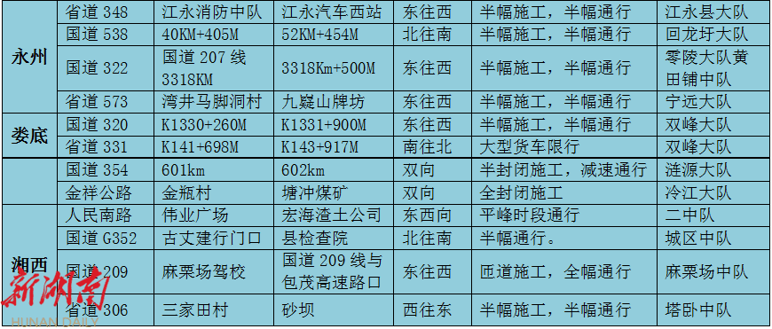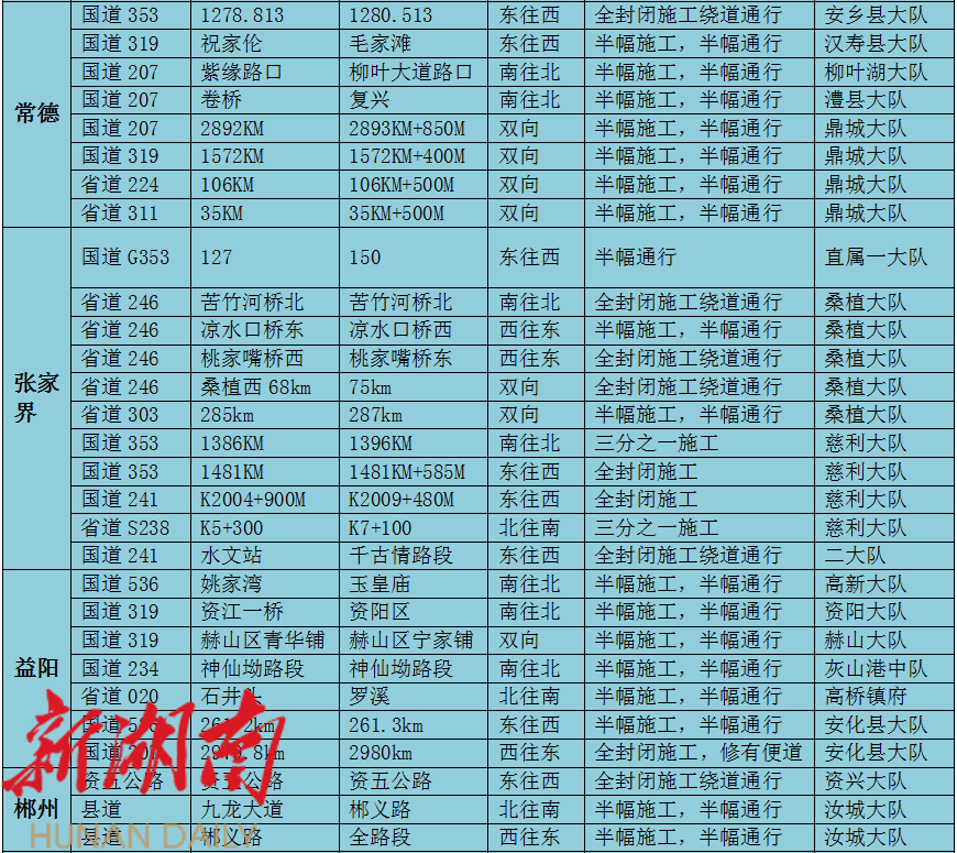 全省国省道共有计划施工点段60处,部分点段易出现短时交通缓行。据初步统计,假期全省国道、省道共有计划施工点段60处。从市州分布看,张家界12处,常德、长沙各8处,益阳7处,岳阳5处,娄底、湘西、永州各4处,郴州3处,衡阳2处,邵阳1处。从涉及道路看,国道35处,省道25处。从交通组织方式看,全封闭绕行16处,半幅通行44处。 全省热门景区易缓行路段和事故多发路段情况