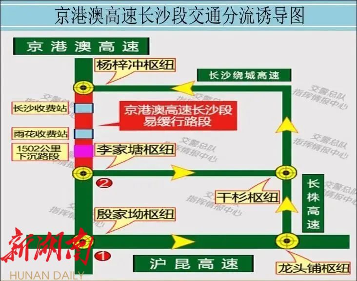 缓行路段为杨梓冲枢纽至李家塘枢纽。 绕行建议:一是