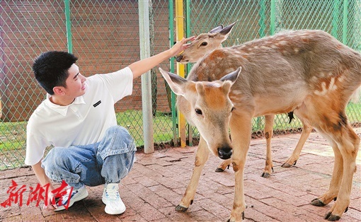 △4月27日,青年观察员与梅花鹿亲密互动。湖南日报全媒体记者 成俊峰 摄