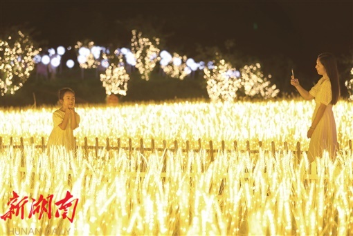 △2020年7月31日,衡阳市珠晖区茶山坳镇堰头村,游客在金甲梨园灯展中给孩子拍照。(资料图片) 曹正平 摄